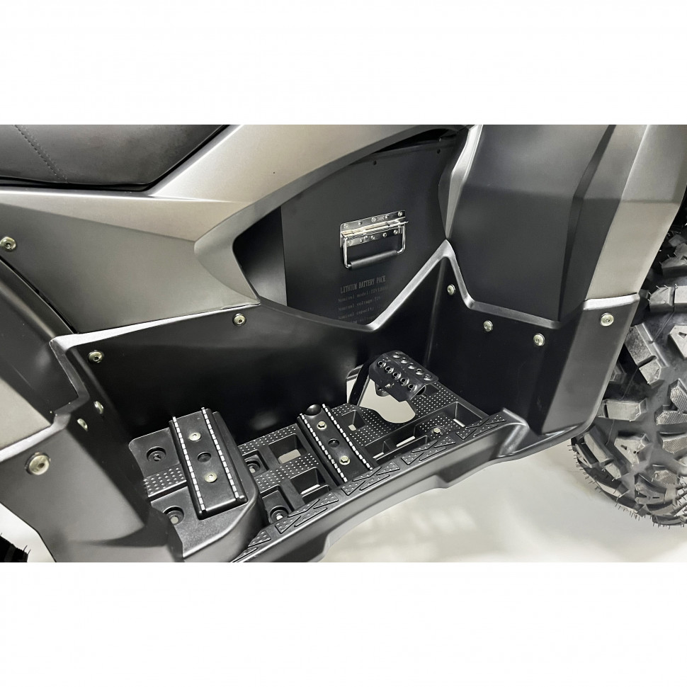 Шасси электроквадроцикла оснащено дифференциальной передачей и регулируемыми амортизаторами, что обеспечивает отличную управляемость и комфортную езду. Дисковые гидравлические тормоза на передних и задних колесах гарантируют надежное торможение, что повышает безопасность при движении по сложным маршрутам.