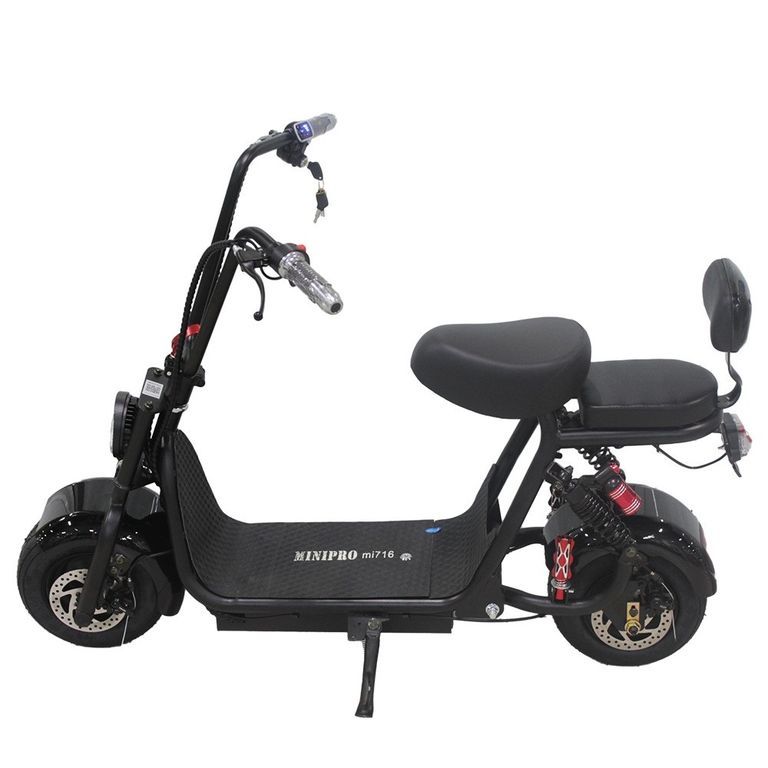 ЭЛЕКТРОСКУТЕР MiniPro mi716 800W 16Ah | Электроскутер с широкими колесами, двойным сиденьем и амортизаторами. MINIPRO mi716 разгоняется до 60 км/ч и подходит для долгих поездок. Он заводится ключом, имеет яркую переднюю фару и широкую деку. Для второго пассажира предусмотрена спинка и подставки под ноги.