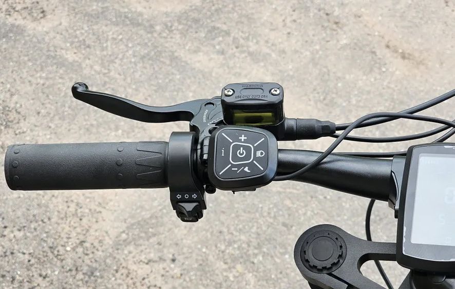 Гидравлические тормоза на задних колесах обеспечивают надежное и плавное торможение, что делает поездки более безопасными. На руле расположены все элементы управления, включая ручку газа, ручку тормоза и дисплей, который отображает скорость, уровень заряда аккумулятора и пробег.